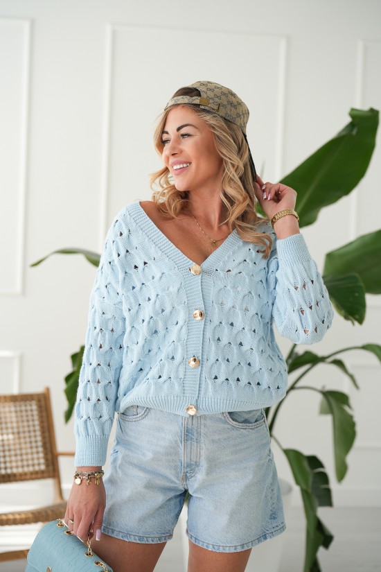 Elegancki ażurowy sweter ze złotymi guzikami w kolorze błękitnym