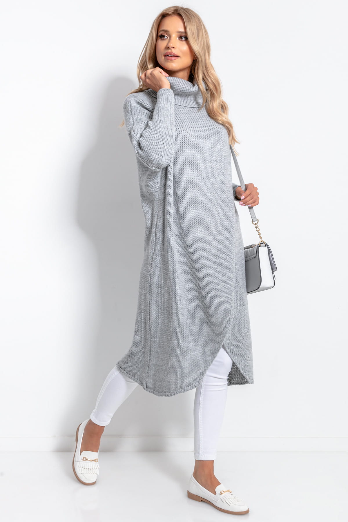 Długi sweter z rozcięciem i wysokim golfem F1052 szary