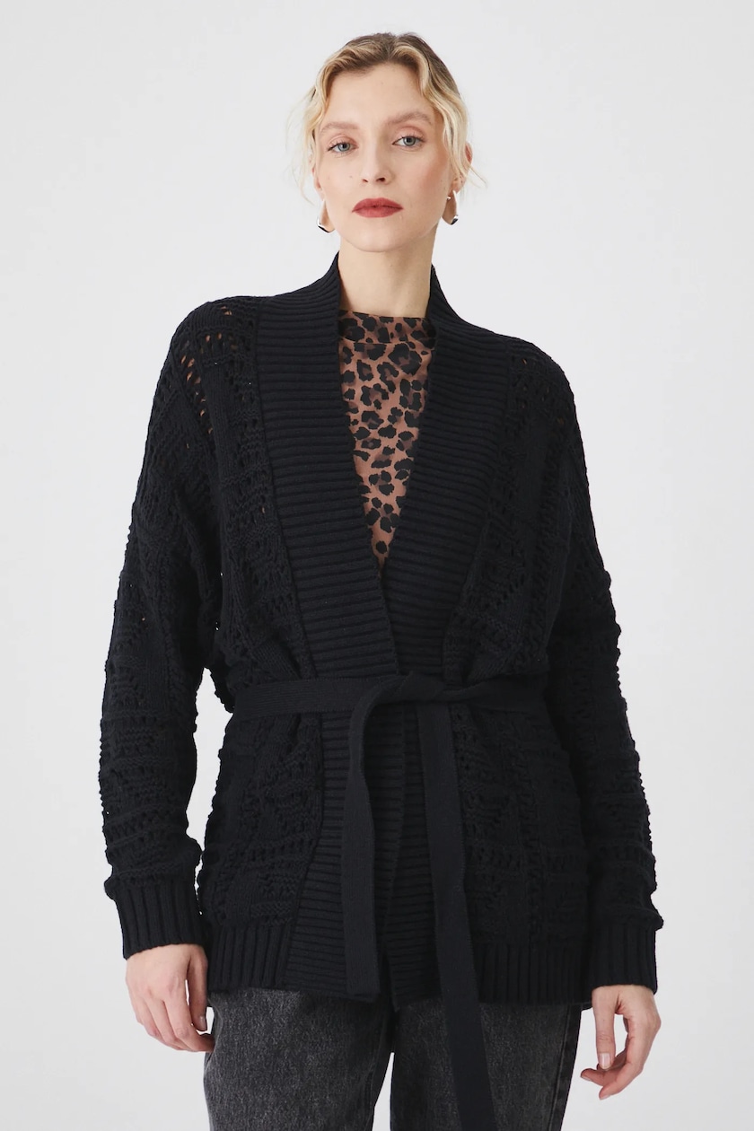 Kardigan damski z paskiem ażurowy kolor czarny MEDICINE