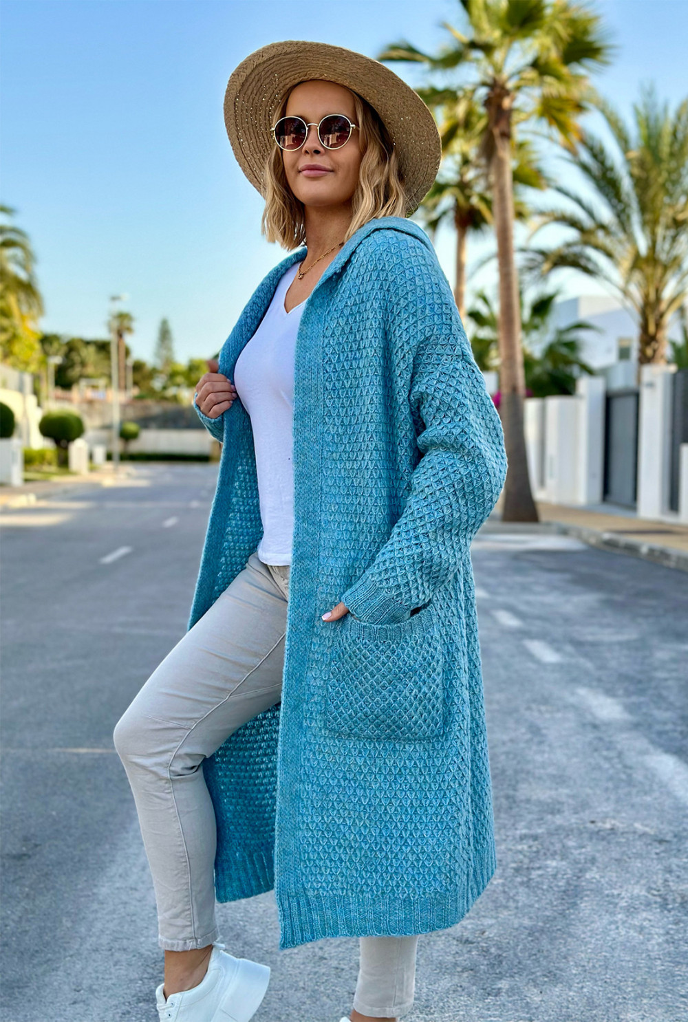 Długi kardigan z kieszeniami i kapturem Luise Turkus Beverly6