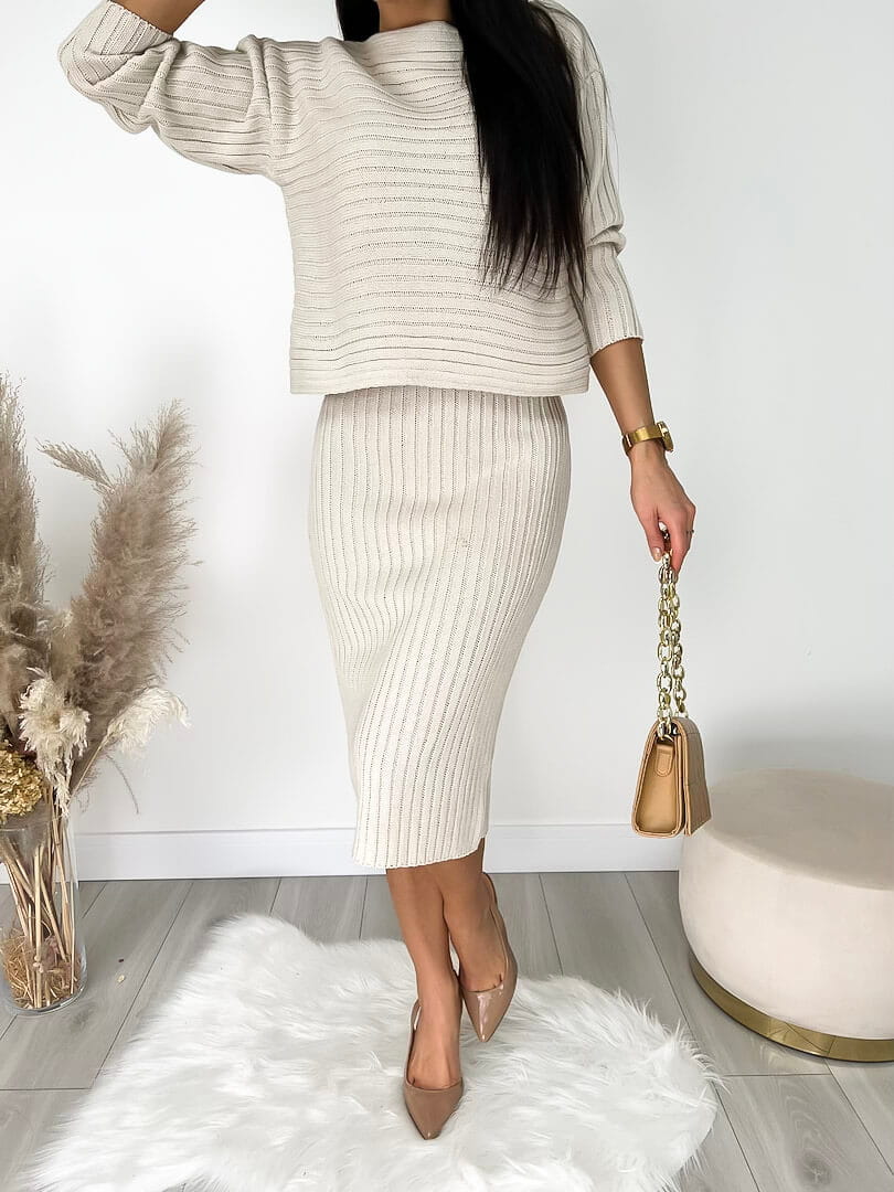 Beżowy Komplet Sukienka+Sweterek 9248 171 A Modna Kiecka