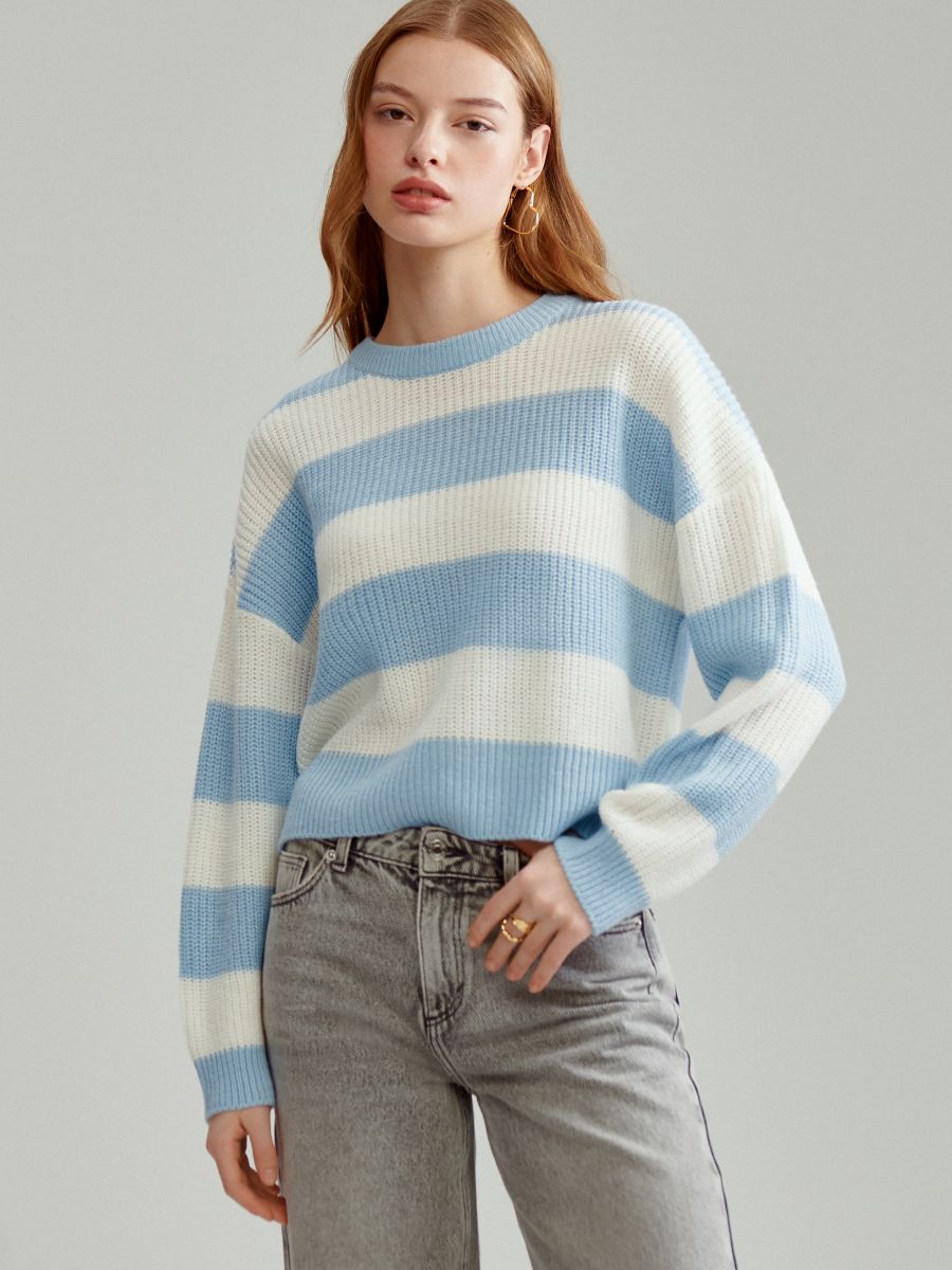 Sweter w niebiesko białe paski z okrągłym dekoltem HOUSE 203AB ST3